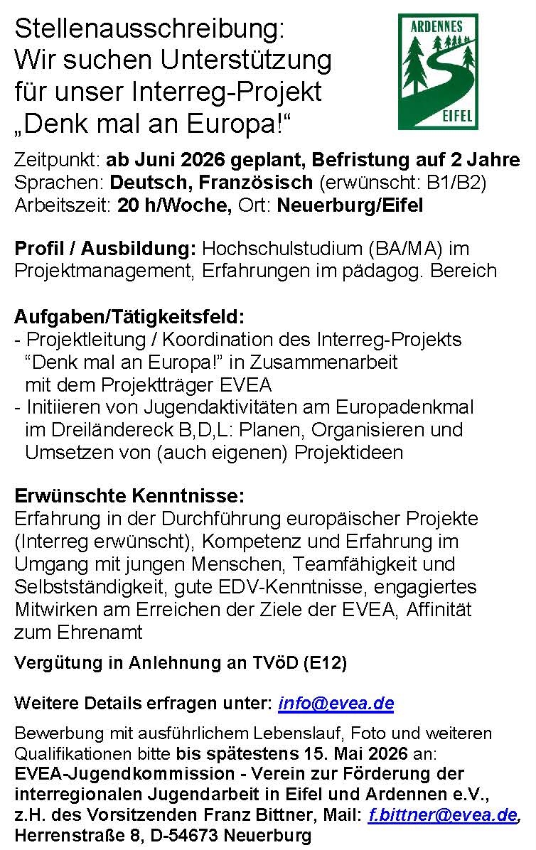 Zum Europatag 2026, Samstag, den 9. Mai, lädt die EVEA zu einem Aktionstag mit Wanderungen am Europadenkmal und im Dreiländereck ein. Geführte Sternwanderungen, Start ist jeweils um 10.30 Uhr, aus den angrenzenden Ländern führen von Sevenig (D), Welchenhausen (B) und Lieler (L) zum Europadenkmal. Von dort startet eine geführte Dreiländer-Kulturwanderung nach Ouren. Diese Route ist zugleich der 100. Jugendwanderweg der Deutschen Wanderjugend. Die Versorgung mit Verpflegung und Getränken erfolgt in bewährter Weise mit Unterstützung der Vereinsgemeinschaft Dahnen-Lieler-Ouren. Anmeldeformular